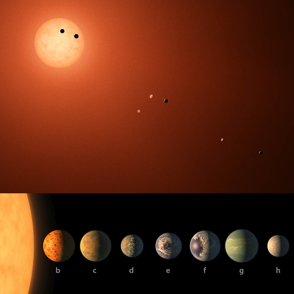 In 2017, a planetary system called TRAPPIST-1 (TRAnsiting Planets and Planetesimals Small Telescope), located 12 parsecs away from the Solar system, within the constellation of Aquarius found by the ground and space telescopes. It consists of seven Earth-sized closely packed planets orbiting a small, red star. By knowing their diameter and the gravitational influences between these closely packed planets, the mass of each planet can be determined.