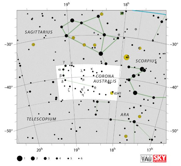 The neighbouring constellations of Corona Australis are Sagittarius to the north, Scorpius to the west, Telescopium to the south and Ara to the southwest. The meteor shower respective to which will be Corona Australids which are active between March 14th to March 18th and it peaks on March 16th each year. Average of about 5 to 7 meteors per hour can be seen.