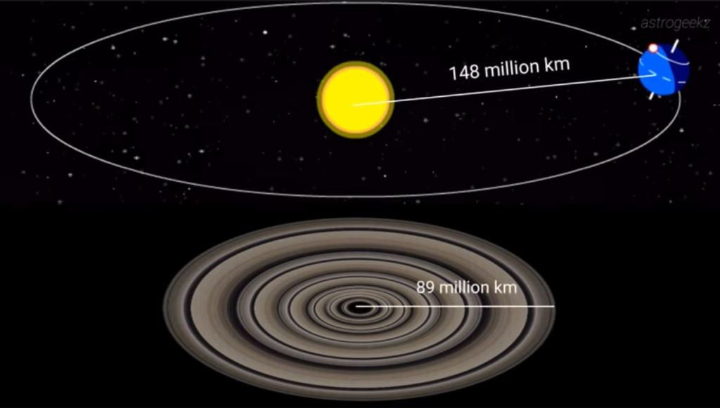 The distance between the Sun and the Earth is 148 million km whereas, J1407 b exoplanet has a ring system that has an outer radius of approximately 89 million km which is like 640 times the extent of Saturn’s ring! Just remember that J1407 b is the true “Lord of the Rings” or also known as “Super Saturn“. The exoplanet has 37 rings in total.