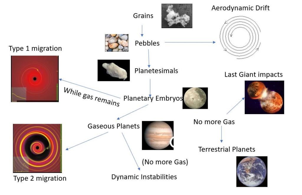 There are the different stages of Planet formation. Starting from dust grains within the gas dominated by young stars, stick around forming the pebbles. Pebbles clump together and form planetesimals. These planetesimals bash into each other and grow into embryos or cores. While there is gas in the disk, those cores can also change their orbits due to orbital migrations. These objects embedded within the disk tend to create spiral density waves and can migrate around, causing Type 1 migration. While there is gas, these cores can join together to form Jovian planets like Jupiter. These can also migrate and they tend to have a different type of migration usually called as Type 2 migration. Here the density waves can be seen. But instead of being embedded within the disk, it creates a sort of angular gap between the disk. Once the gas is gone, after a few million years, the giant planets can go unstable. In this case, due to its interaction with other planets, they tend to move away from its orbit. Once the gas is completely gone, there will be a final phase of giant impacts. Thus finally, rocky planets will be formed.